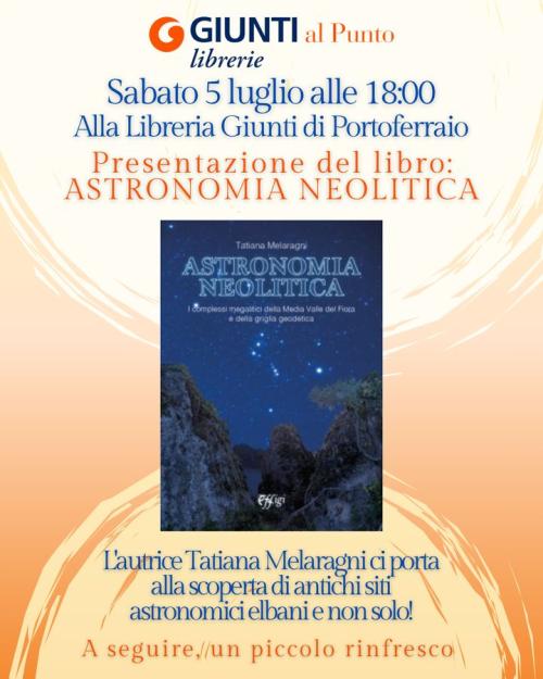 Sabato 5 luglio alle 18:00 presso la Libreria Giunti di Portoferraio si terrà la presentazione di "Astronomia neolitica", frutto degli studi dell'archeologa Tatiana Melaragni.