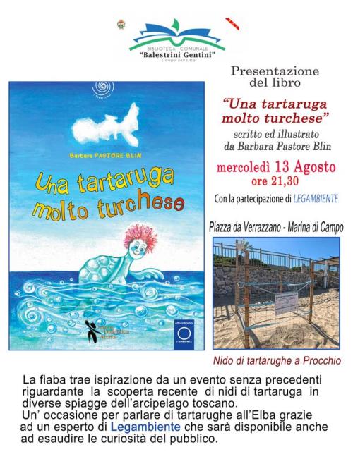 Il 13 agosto alle 21,30 in Piazza da Verrazzano a Marina di Campo la Biblioteca Comunale “Balestrini Gentini” organizza la presentazione del libro "Una tartaruga molto turchese" una fiaba ambientata all’Elba è scritta ed illustrata da Barbara Pastore Blin, nell’ambito della rassegna letteraria Storie Itineranti 2025.