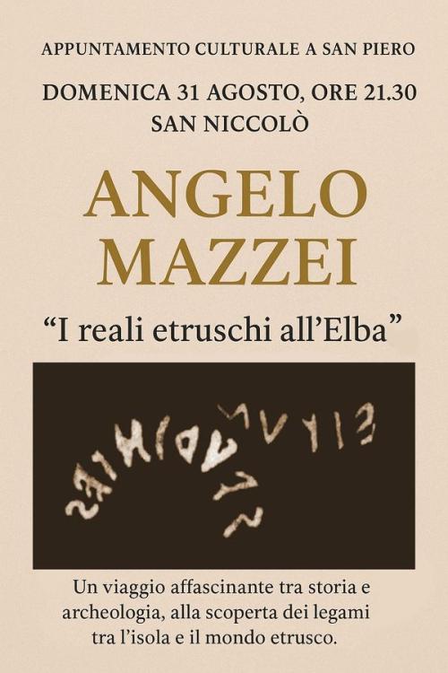 Domenica 31 agosto, alle ore 21.30 nel chiostro di San Niccolò, Angelo Mazzei, acuto studioso dei cosiddetti “popoli preromani” e indagatore della civiltà etrusca in un'ampia accezione culturale che va dalla linguistica alla religione e dall'archeologia all'economia, ci parlerà de “I reali etruschi all'Isola d'Elba”, ovvero della presenza di alti esponenti provenienti da famiglie al potere nelle città stato e confederazioni etrusche e presenti su quest'isola, tanto importante nel mondo antico per i giacimenti minerari.