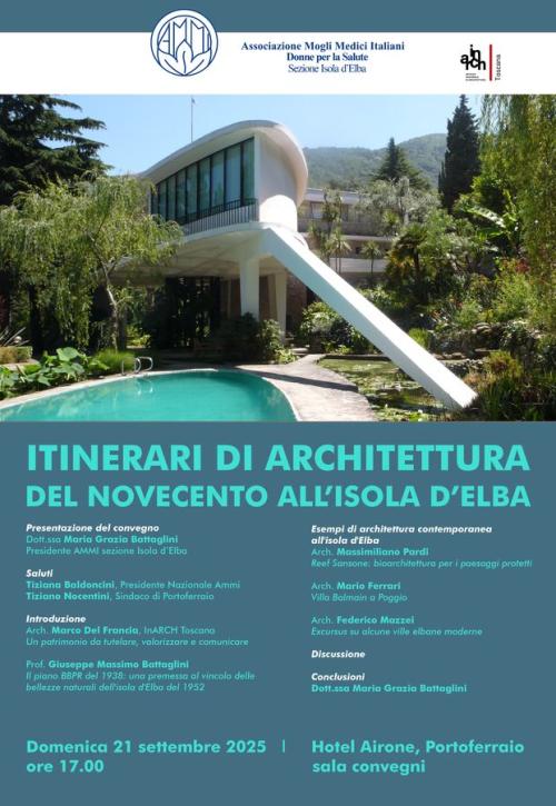 La sezione elbana dell’AMMI – Associazione Mogli Medici Italiani, Donne per la Salute - in armonia con quanto previsto dallo statuto dell'organizzazione stessa, ha organizzato a Portoferraio un convegno dal titolo “Itinerari di Architettura del Novecento all’Isola d’Elba”, un appuntamento culturale che vuole valorizzare e far conoscere il patrimonio architettonico dell’isola, dalle esperienze del Novecento fino alle testimonianze contemporanee.