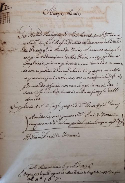 Gio. Batta Batignani della Rocca umilissimo Servo e Suddito di Vostra Altezza Reale essendo stato condannato dal Governatore di Portoferraio in pena di Forca col riservo a supplicargli per la moderazione della pena, e ciò per pretesa complicità ma non provata in un omicidio commesso con esplosione da un di lui compagno non solo a provocazione violenta ma a necessaria difesa per avendo sofferta non meno lunga carcere ( ) sette colpi di archibusata nell’atto fattogli dell’arresto.