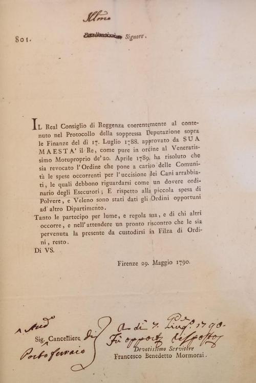 Francesco Benedetto Marmorai, ”devotissimo servitore”, senatore soprassindaco della Camera della Comunità in Firenze, nel maggio del 1790, invia circolare in stampa all’Auditore (giudice) di Portoferraio che ricopre anche la carica di cancelliere della magistratura comunitativa (comune) della città.