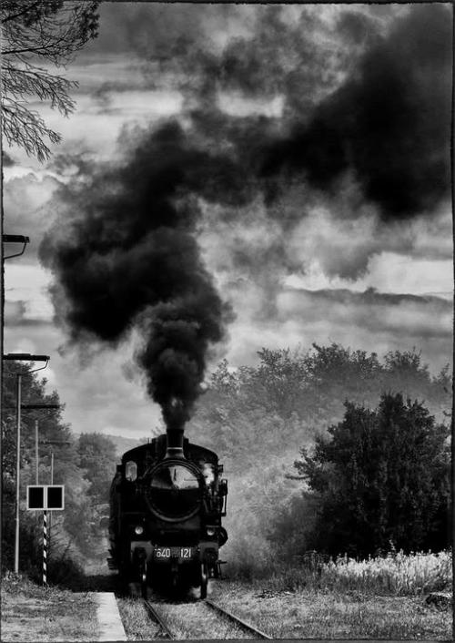 Nell’immagine scelta, il nero si fa protagonista assoluto: denso, materico, vivo. Il fumo che si leva potente dalla locomotiva a vapore non è solo elemento visivo, ma racconto. È memoria industriale, forza, movimento, passato che ancora pulsa. La massa scura che si staglia contro il cielo chiaro crea un contrasto drammatico e affascinante, guidando lo sguardo e dando ritmo alla composizione. Il bianco e nero amplifica l’impatto emotivo, trasformando il fumo in una pennellata espressiva che domina la scena.