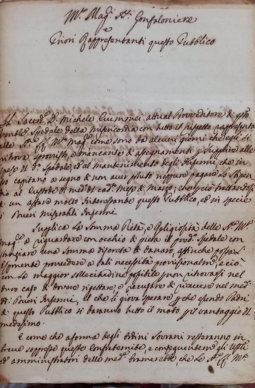 Supplica la somma Pietà e Religiosità delle Signorìe Molto Magnifiche a riguardare con occhio di pietà il predetto Spedale con stanziare una somma discreta di denaro affinchè possasi espressamente provvedere a tali necessità provvisionalmente e ciò con la maggiore sollecitudine possibile per non ritrovarsi nel nuovo caso di dover rigettare e recusare di dovere ricevere nel medesimo Ospedale i poveri Infermi il che li giova sperare perché essendo Padri di questo Pubblico si daranno tutto il moto per vantaggio del medesimo e come a forma degli ordini Sovrani resteranno in breve soppresse queste Confraternite gli Uffiziali et amministratori delle medesime bramerebbe che le Signorie Loro Molto Magnifiche come Soprintendenti del medesimo Spedale che deve sussistere e che veniva diretto dagli Ufficiali stessi della Reverenda Chiesa della Misericordia, si compiacessero di dargli subito quelle istruzioni e regolamenti che dovrà l’esponente tenere in futuro in rapporto all’amministrazione del predetto Ospedale ;con che fa alle Signorie Loro Molto Magnifiche devotissima reverenza