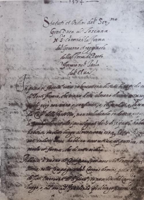 Nell'immagine di copertina - Anno 1574. Statuti di Portoferraio. PRIMA PAGINA (“Statuti del comune di Firenze e dei comuni soggetti, 620-649” Classe XII Portoferraio. Archivio stato Firenze)