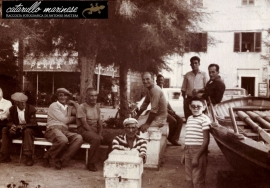 Nella foto che vedete – che, dato le magliette a strisce, dovrebbe essere degli anni ’60 – in un giorno che sembrerebbe di tarda primavera, Franchino guarda impavido la macchina fotografica con i suoi occhiali spessi come un culo di bottiglia. E’ insieme, naturalmente insieme, a uomini grandi e grossi, forti ed esperti della vita, del mare e del nostro piccolo mondo e, accanto a lui, accovacciato dietro a uno dei pilastri che scavalcavamo come rane a gambe aperte per allenarci a Dissi o a Cero-cero la Cavalla di Montenero, anche lui con una maglietta a righe “da ragazzo”, c’è Adamo, il giullare iconoclasta della Marina. E’ una delle commoventi foto di quegli anni in cui La Marina era ancora una comunità che non lasciava nessuno indietro e dove ognuno aveva il suo posto e il suo ruolo. Franchino era il piccolo ago che cuciva ancora tra strade e case la minuta storia giornaliera di un Paese in attesa del futuro.