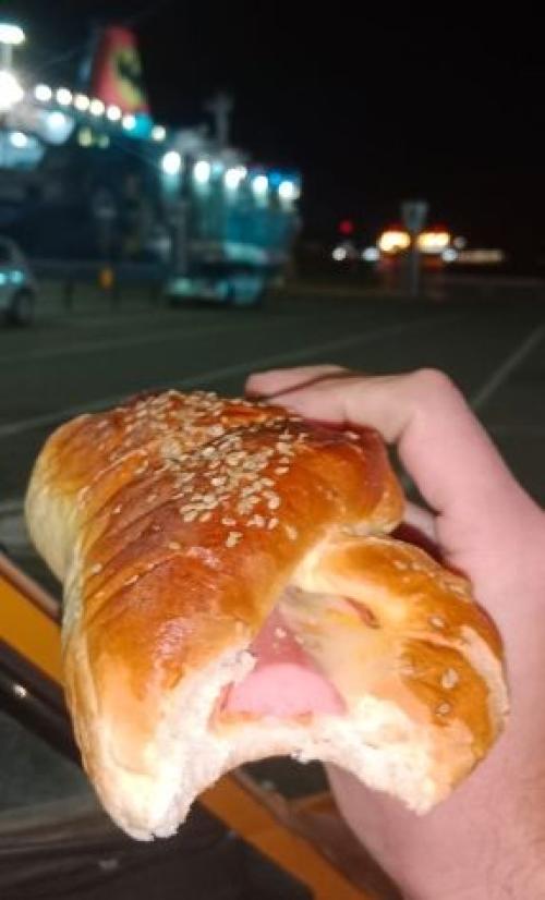 Mi mangio l'ultimo pezzo di rosticceria, in attesa dell' imbarco per l'Elba.