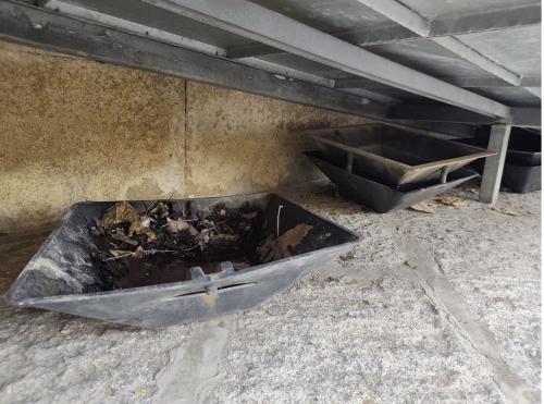 Mirabile soluzione di un problema. L'immagine mostra, forse una mezza dozzina di grosse vasche di materiale plastico, usate per la decantazione delle acque piovane, originariamente (e giustamente) collocate sotto i tombini del sistema fognario del centro storico ferajese.