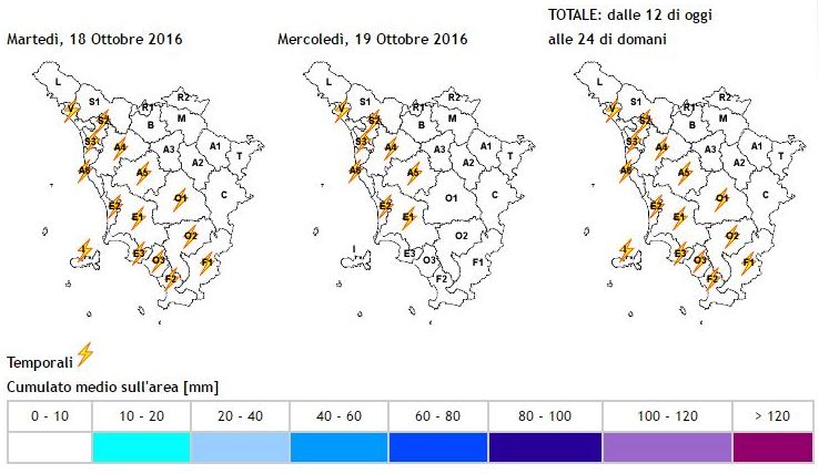 Previsioni fino alle 24 di domani, mercoledi 19 ottobre: