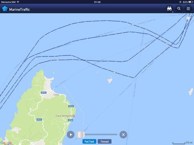 Fa pensare anche la ricostruzione della rotta mantenuta dal traghetto della Moby, proposta da Carlo Dotto su Face-Book ed estrapolata dal sito Marine Traffic, che riproponiamo, e che mostra come il traghetto (la traccia registrata dal satellite parrebbe quella più a sud) sia passato inusualmente vicino all'isolotto del Frate ed a Palmaiola.