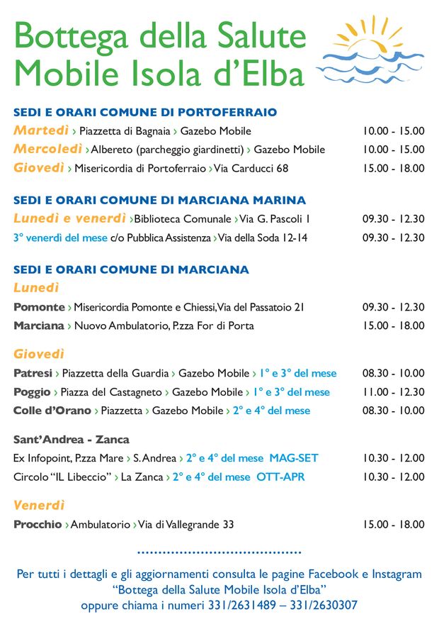Sono poi attivi, in tutti i comuni, i centri di prenotazione presso le Misericordie, Anpas e Bottega della Salute Mobile (Portoferraio, Marciana e Marciana Marina) come da orari della locandina allegata di seguito.