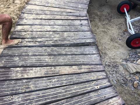 Tavole che si alzano e buche (come si vede in foto) sono un pericolo per i fruitori del passaggio.