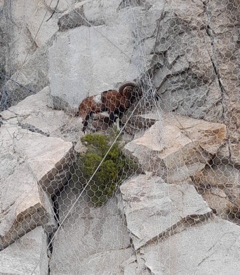 Infatti, mentre un falco pellegrino, una civetta e un gabbiano partono per il CRUMA di Livorno, arriva la chiamata per un muflone adulto rimasto incastrato all’interno di una rete di protezione dalla caduta massi in località Punta Nera nel Comune di Marciana. Un bell’esemplare intorno ai 4 anni che non solo si è infilato sotto la rete, ma, cercando di uscirne, ha peggiorato la situazione arrampicandosi più in alto e rendendo più complicato il soccorso.