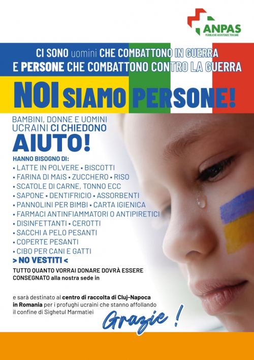 Da lunedi 7 marzo verrà aperto un nuovo centro di raccolta presso la sede del Coordinamento delle Pubbliche Assistenze Anpas in Viale Elba 17, dalle 10 alle 13 e dalle 15 alle 17, dal lunedì al sabato.