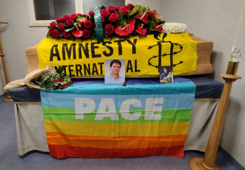 Nella foto, l'allestimento del feretro del giornalista scomparso.