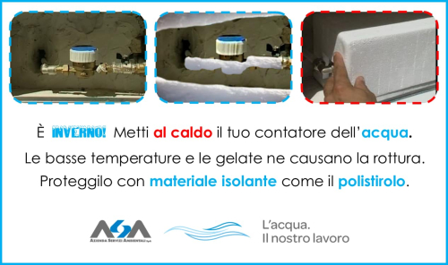 Con l’arrivo della stagione invernale e, soprattutto, dei primi bruschi abbassamenti di temperatura, torna la campagna di sensibilizzazione “Metti al caldo il tuo contatore”. La campagna ha lo scopo di sensibilizzare il cliente sull’importanza di un corretto isolamento termico dei misuratori d’acqua durante il periodo invernale.