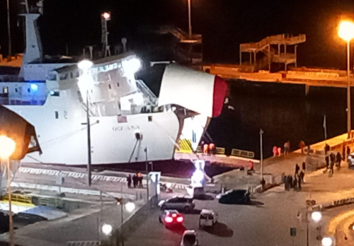 I danni riportati dal traghetto al bulbo di prua non sembrerebbero gravi.