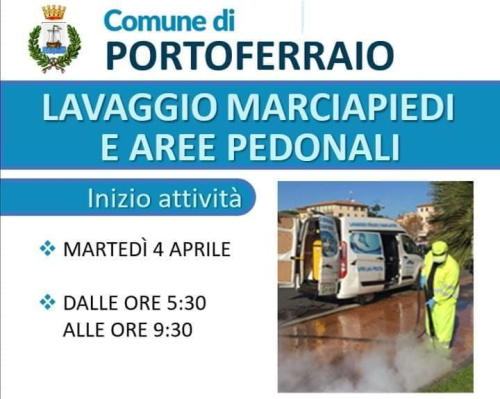 Il Comune di Portoferraio informa i cittadini che nelle prime ore della giornata di martedi 4 aprile (dalle ore 5,30 alle ore 9,30) verrà effettuato da ESA il lavaggio dei marciapiedi e delle aree pedonali della città.