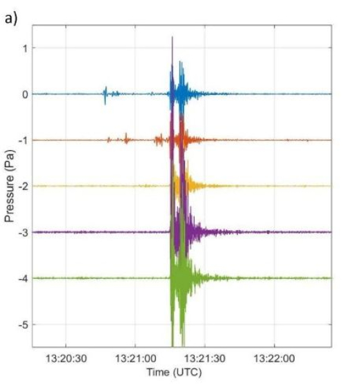Figura 1 - Segnale infrasonico registrato ai 5 sensori dell'array ELB. In b, le tre componenti registrate dal sismometro.