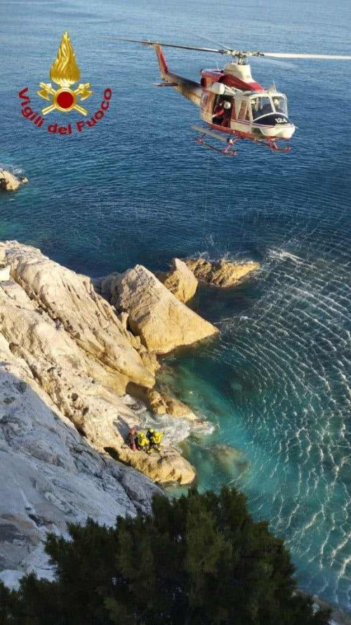 L'uomo, dopo aver provato a recuperare il cane che era scappato lungo la scarpata, si è reso contro di essere bloccato sulla scogliera a pochi metri dal mare, non più in grado nè di scendere né di risalire. A quel punto ha chiesto aiuto.