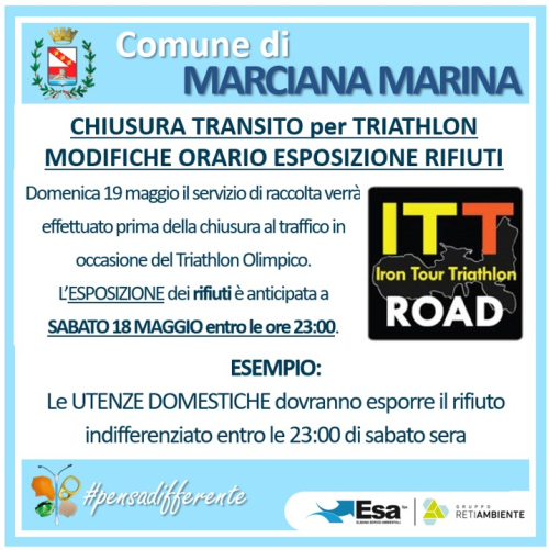 ESA spa comunica che domenica 19 Maggio a Marciana Marina, in occasione del Triathlon Olimpico e della seconda tappa dell'Iron Tour Italy, l’orario di raccolta rifiuti subirà le seguenti variazioni a causa della chiusura temporanea del tratto di strada provinciale 25 tra Marciana Marina e Procchio dalle ore 10,45 alle ore 13 e del divieto di transito e sosta dalle 7 alle 16 in Via Dussol, Via XX settembre, Lungomare Regina Margherita, Piazza della Vittoria, Scali Mazzini, Viale Aldo Moro tratto basso, Via Bonanno, Via Lo Schioppo.