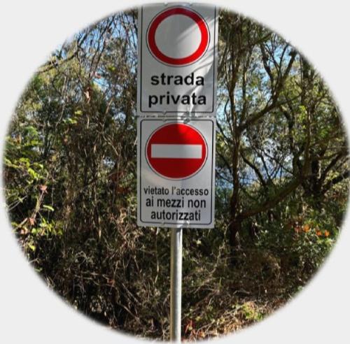 Il cartello riprodotto a lato indica che siamo di fronte a una strada privata dov’è vietato l’accesso ai mezzi non autorizzati (da chi?).