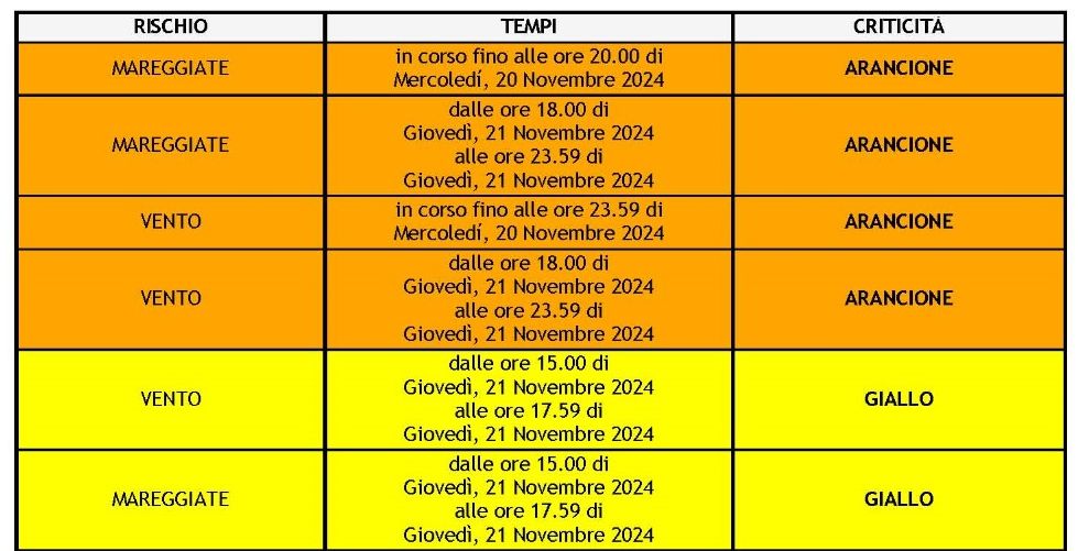 Sono previsti fenomeni pericolosi per l'incolumità delle persone, in grado di causare disagi anche prolungati e danni consistenti su aree anche estese. Sono possibili rotture di rami e/o caduta di alberi, caduta di tegole e cornicioni, danni alle strutture provvisorie ed in maniera isolata agli edifici, con trasporto di materiale vario. Sono possibili problemi alla circolazione stradale in particolare su viadotti e ponti, con interruzione della viabilità. Sono possibili disagi a causa di ritardi o cancellazioni dei collegamenti terrestri, ferroviari, aerei e marittimi. Sono possibili danneggiamenti alle reti aeree di distribuzione di servizi (tra cui telefonia ed elettricità) con interruzioni dei servizi.