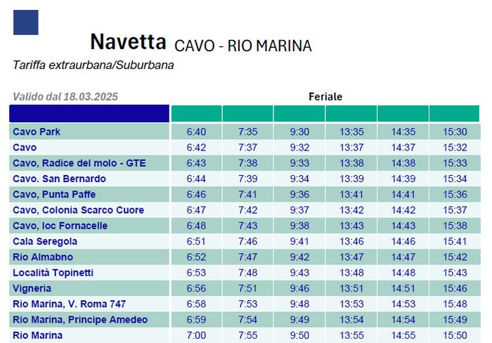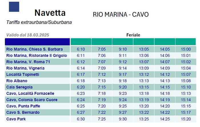 Il collegamento da Rio Marina a Cavo e da Cavo a Rio Marina invece sarà garantito nei giorni feriali da un servizio navetta valido nell’arco orario dalle ore 6:10 alle ore 15:50.