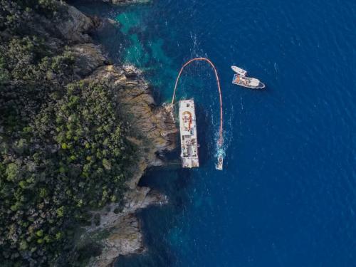 Al termine delle operazioni di verifica – anche subacquee – che hanno scongiurato la possibilità di inquinamento delle splendide acque dell’arcipelago toscano, in via precauzionale sono state stese le cortine di “panne galleggianti”, ossia i dispositivi di contenimento che isolano lo scafo dalle acque circostanti.