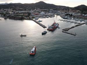 Il convoglio formato per il trasporto della nave ha quindi navigato per più di tre ore a velocità ridotta, trasferendo la nave dal promontorio dell’Enfola fino all’interno del porto di Portoferraio in condizioni particolarmente impegnative, soprattutto a causa del forte vento da nord che ha causato onde di due metri di altezza.