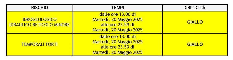 Dalla sede della Protezione civile è stata emanata un'allerta meteo, a criticità gialla, per temporali forti e rischio idrogeologico valida dalle ore 13 fino alla mezzanotte di oggi, martedì 20 maggio.