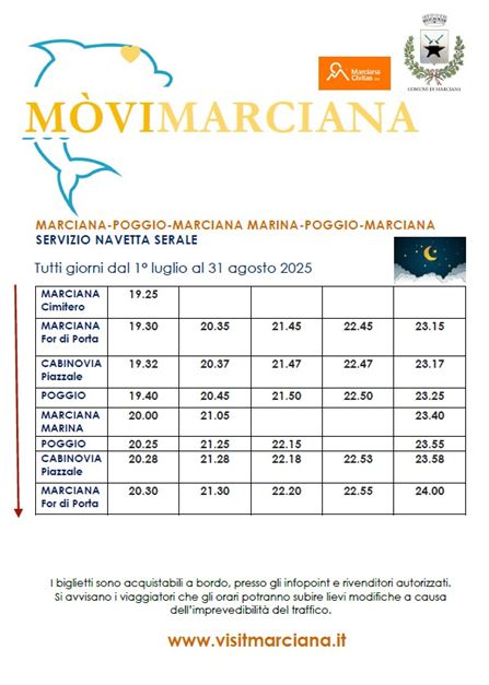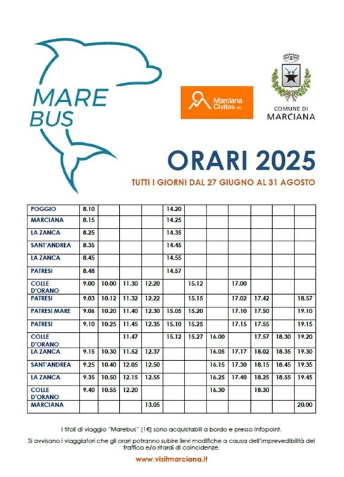 Per ulteriori informazioni sugli orari e le fermate, si invita la cittadinanza a consultare il sito: www.visitmarciana.it