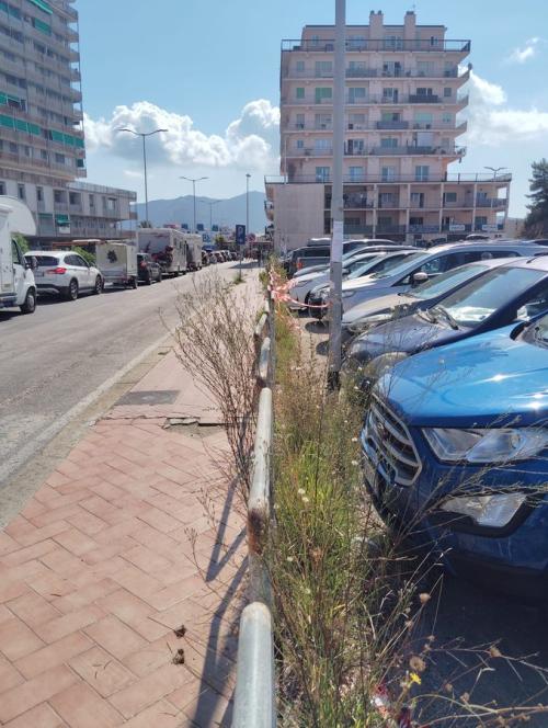 Un degrado che riguarda non solo lo stato del manto dell'area adibita a sosta, ma anche le zone periferiche e i marciapiedi circostanti, come mostrano le immagini.