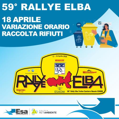 In occasione dello svolgimento del 59° Rallye Elba, previsto per le giornate di venerdì 17 e sabato 18 aprile, si informa la cittadinanza che il servizio di igiene urbana subirà alcune modifiche. A causa della chiusura temporanea di diversi tratti stradali per consentire il passaggio della gara, gli orari di esposizione e raccolta dei rifiuti per le utenze domestiche e non domestiche saranno variati nei comuni di Capoliveri e Rio.
