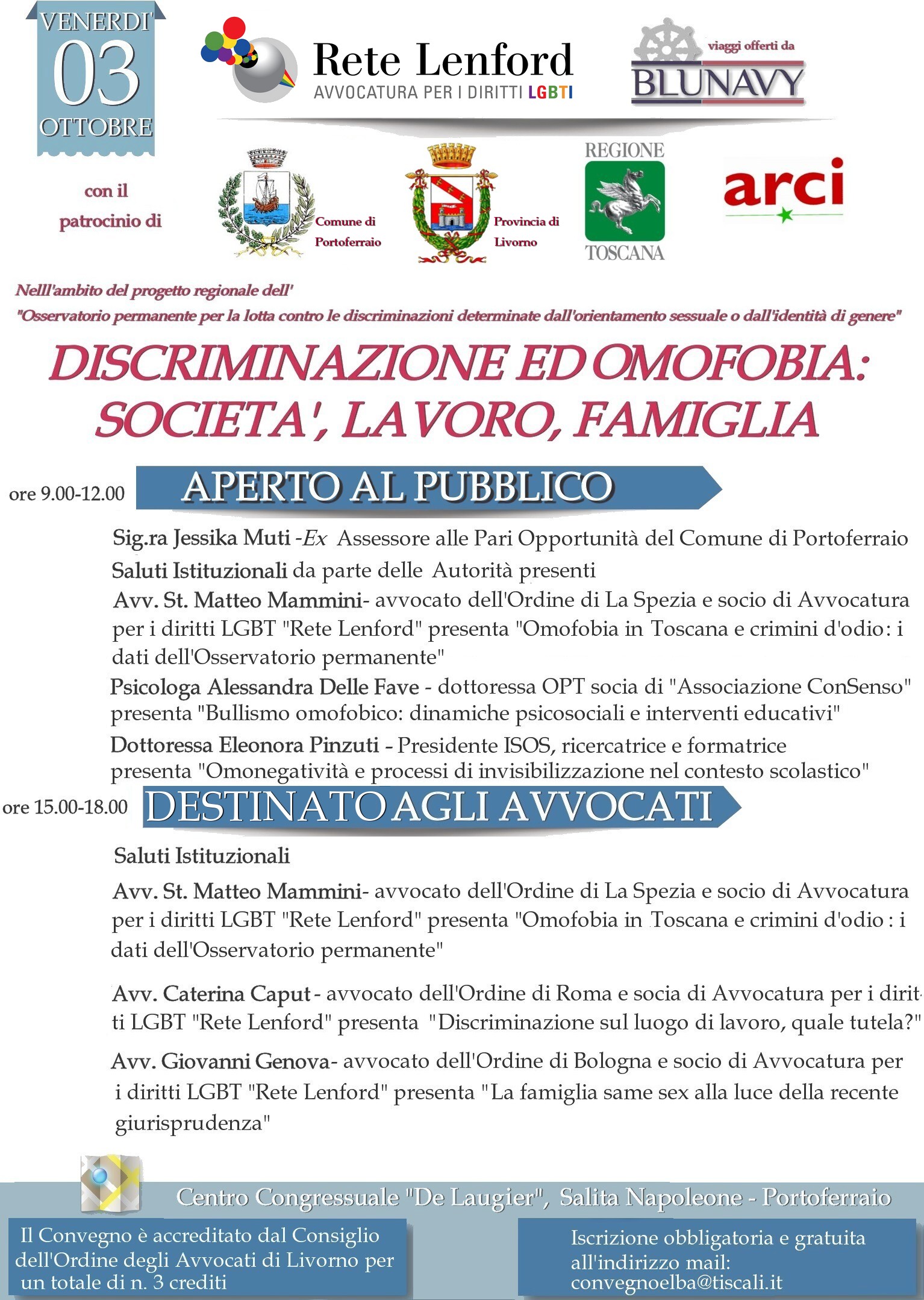 Venerdì 3 Ottobre 2014 alle 9.oo presso il Centro Congressi De Laugier, sala Nello Santi, si svolgerà il convegno dal titolo “discriminazione ed omofobia: società, lavoro, famiglia” è stato organizzato dall'Avvocatura per i diritti LGBT "Rete Lenford , con il Patrocinio della Regione Toscana , Provincia di Livorno e dal Comune di Portoferraio Assessorato Pari Opportunità, per proporre al pubblico in generale, ma soprattutto, agli insegnanti ed ai loro studenti, utili strumenti per affrontare il nascente disagio che vivono i ragazzi pre-adolescenti ed adolescenti nello scoprire e vivere il loro orientamento sessuale o la loro identità di genere, e, al contempo, il modo di porsi degli insegnanti, primi, oltre i genitori, a dover guidare i giovani in questa difficile scoperta che, se mal interiorizzata, può condurre a gesti estremi spesso presenti sulle pagine di cronaca, anche locale; in molti, tra i ragazzi del territorio, si costringono a fuggire lontano da casa, dagli affetti e dagli amici di sempre; lontano da un’isola che forse non sentono preparata per la loro accettazione.