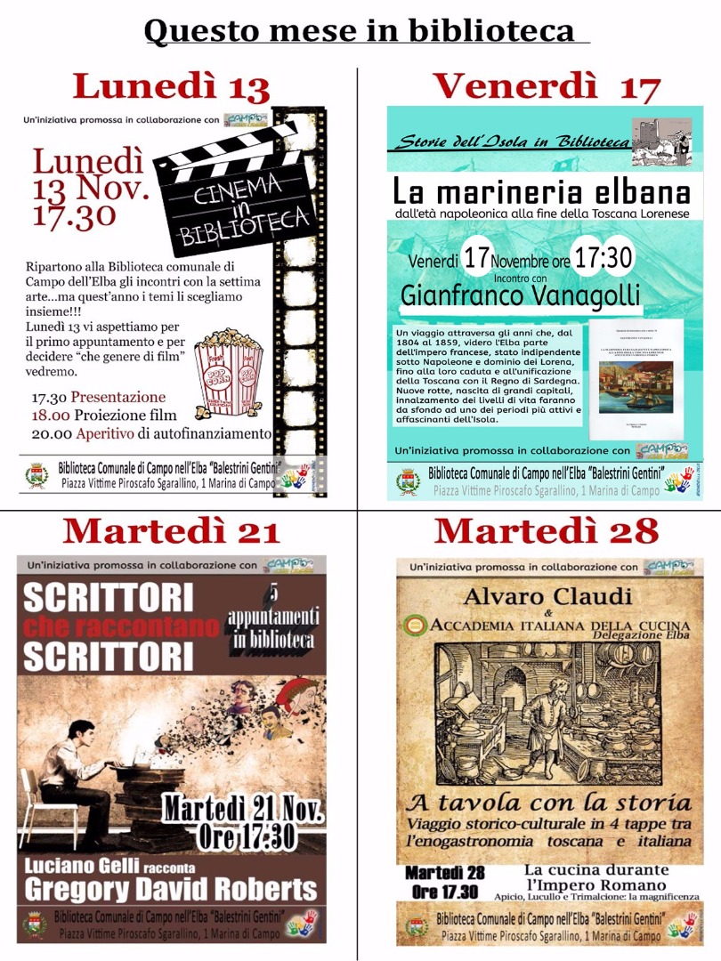 Dopo gli appuntamenti della rassegna estiva, infatti, riprendono le iniziative della biblioteca comunale di Campo nell'Elba. Da novembre e per tutto l'inverno ospiteremo film, iniziative culturali, incontri pubblici...e tanto altro!