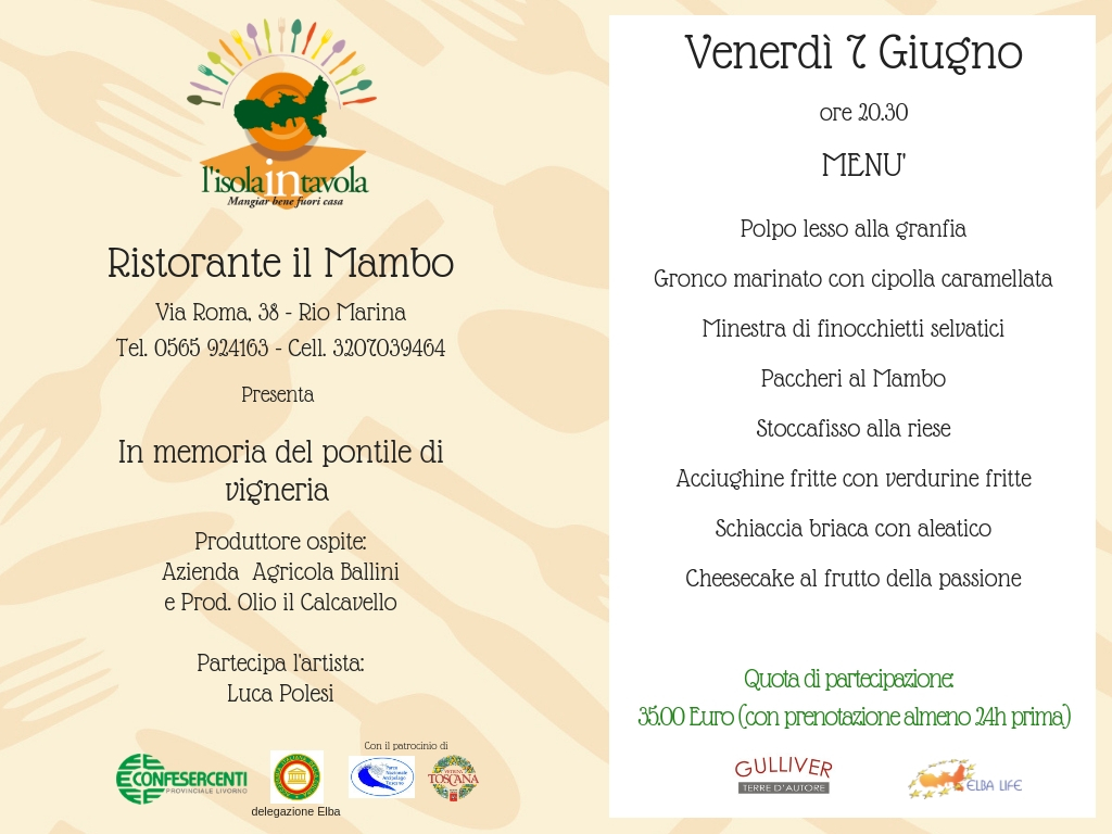 Venerdi 7 giugno serata conclusiva della 5^ edizione de l’isola in Tavola al ristorante Mambo di Rio Marina. Il paese minerario farà da cornice finale ad una delle più belle e partecipate edizioni della rassegna gastronomica organizzata da Confesercenti, in collaborazione con l’Accademia Italiana della Cucina ed il patrocinio di Vetrina Toscana a Tavola e Parco nazionale Arcipelago Toscano.