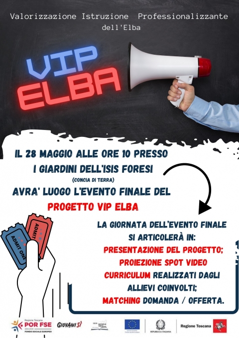 Venerdì 28 maggio, nei Giardini dell'Isis Foresi a Concia di Terra, si svolgerà l'evento finale di "V.I.P. Elba", il progetto per la Valorizzazione dell'Istruzione professionalizzante della nostra isola. Sei le classi coinvolte, tre del Foresi e tre del Cerboni. Per l'istituto tecnico elbano si tratta delle due quarte turistico e della quarta amministrazione, finanza e marketing, mentre per l'alberghiero Foresi, sono la terza cucina, la quarta e la quinta cucina e sala.