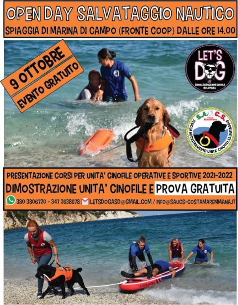 Si informa che la scuola di educazione cinofila dell'Isola d'Elba LET'S DOG ha organizzato il 9 ottobre, sulla spiaggia di Campo nell'Elba, dalle 14 alle 18 un primo allenamento gratuito aperto a tutti. Le unità cinofile saranno impegnate in una dimostrazione sulle attività di salvataggio e l'iniziativa si svolgerà nel tratto di spiaggia di fronte alla Coop.
