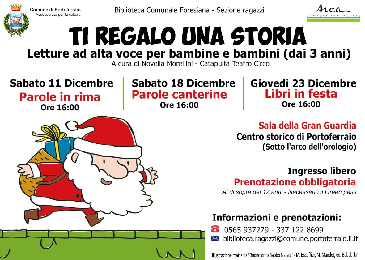 La Biblioteca comunale foresiana organizza per i giorni 11, 18 e 23 dicembre "Ti regalo una storia" Letture di Natale gratuite per bambini presso la Sala della Gran Guardia a Portoferraio.
