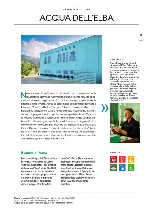 10 pagine per presentare100 campioni della sostenibilità: aziende che Forbes ha selezionato per gli sforzi verso una sostenibilità non solo sul piano ambientale ma anche su quello economico e sociale. Tra le aziende menzionate, anche Acqua dell’Elba, con il suo progetto pensato per le persone e per l’ambiente.