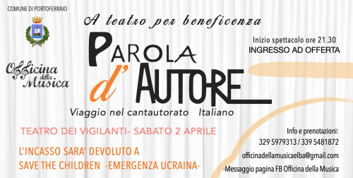 L’Officina della Musica è lieta di invitarvi al Teatro dei Vigilianti - Renato Cioni sabato 2 aprile alla sesta edizione dello spettacolo "PAROLA D'AUTORE", il ricavato della serata sarà devoluto in beneficenza a SAVE THE CHILDREN ITLIA - EMERGENZA UCRAINA DONA PER PROTEGGERE I BAMBINI.