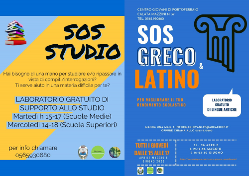 SOS Studio: un vero e proprio laboratorio di supporto allo studio condotto da Ermes Sassaroli (ogni mercoledì dalle 14 alle 18) e da Alfonso Fiumanò (ogni martedì dalle 15 alle 17), rivolto agli studenti delle scuole medie e superiori dell'Elba. La possibilità di migliorare il rendimento scolastico in un ambiente informale e in compresenza, in piccoli gruppi di studenti di classi affini ma diverse, rende particolarmente piacevole questa attività gratuita, strategica per i ragazzi che desiderano migliorare il proprio metodo di studio e il rendimento scolastico.