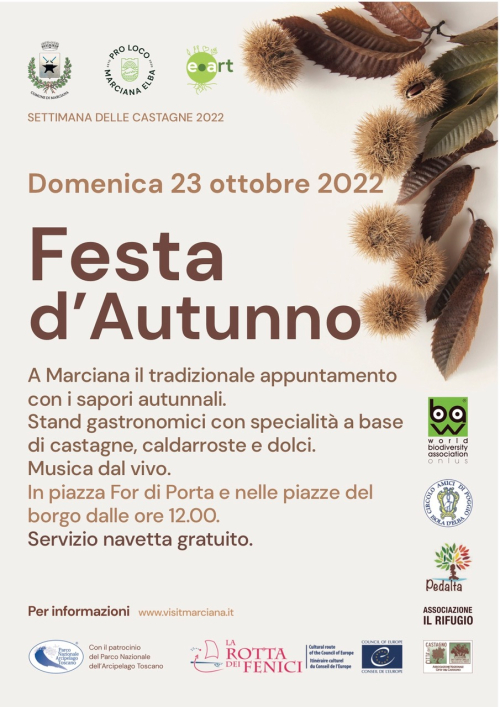 A Marciana la Festa d’Autunno inizierà alle ore 12.00 in piazza For di Porta e nelle piazzette interne con stand gastronomici che proporranno specialità a base di castagne, caldarroste e dolci. Seguirà musica dal vivo.