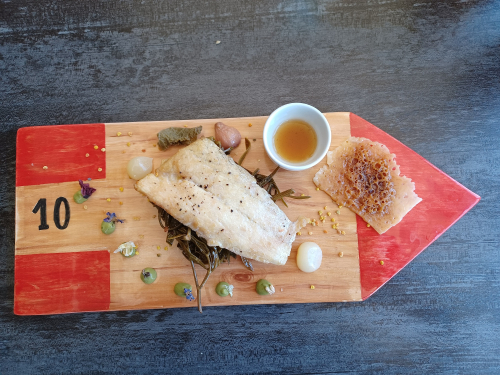 Il piatto sapientemente preparato dalla squadra gigliese, valorizza pienamente le produzioni locali e le tradizioni culinarie delle Isole di Toscana attraverso la presentazione di un filetto di Barracuda su giardiniera selvatica dell’isola del Giglio (finocchio di mare, aglio rosa, aglio triquetro, borragine, lampascione e porro selvatico con olio locale di Bartoletti Gervasio, aglione locale di Biagio Stagno) con crema di erbe selvatiche locali (silene alba, silene Bulgaria, borragine, ortica, piantaggine lanceolata, finocchietto selvatico, papavero e malva), salsa gin-an locale con brodo realizzato mediante palamita locale, finocchio selvatico e riduzione di passito e vino “Senti Oh” dell'azienda locale la Fontuccia dei fratelli Rossi. Cialda al miele e polline locale di "Lacrima di Ra" di Centurioni Mariella e decorazione del piatto con fiori edibili. Inoltre, l’impiattamento è stato valorizzato da un originale piatto di portata in ceramica artigianale che riproduce fedelmente il cartello che porta il nome del sentiero stesso, creato per l’occasione da un’azienda gigliese.