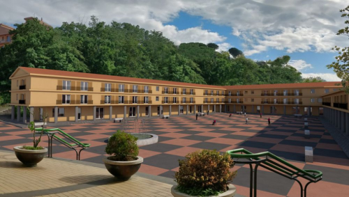 Verrà costruito un maxi fabbricato che si estende a forma di U, a due piani oltre il piano terra, e al piano terreno il complesso avrà una serie continua di portici, che consentono la frequentazione di strutture commerciali, anche in caso di maltempo.