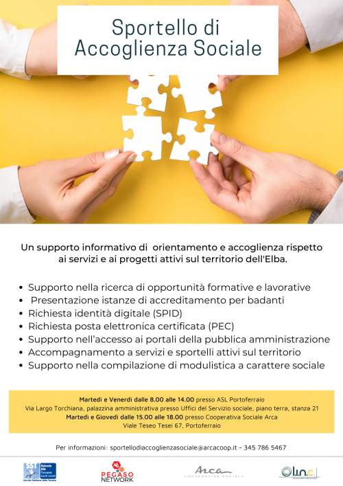 Lo sportello di accoglienza sociale è gestito dalla Cooperativa Arca in sinergia con l’Asl Nord Ovest Toscana Zona Distretto Elba e con il supporto di Pegaso Network e della
