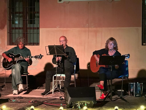 Spiego meglio: parcheggio gratuito in Viale Elba, navetta serale anch'essa gratuita con fermate ben distribuite (servizio del Comune di Portoferraio, ndr A PORTOFERRAIO: SERVIZIO NAVETTA GRATUITO PER I PARCHEGGI) e dopo una fresca e rilassata passeggiata in Calata, un piacevolissimo concerto (The Save Trio, ndr) nell'abbraccio rosa nel chiostro del palazzo comunale, sempre ad ingresso gratuito.