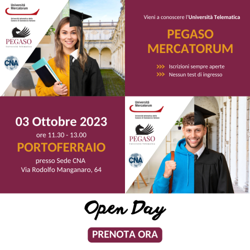 Open day a il 3 ottobre a Portoferraio presso la sede CNA, per orientare gli studenti nella scelta dello studio universitario telematico. Lo organizza CNA che con Pegaso e Mercatorum ha una convenzione a livello nazionale. Le due Università rappresentano realtà consolidate nel panorama degli atenei telematici italiani riconosciuti dal Ministero dell’Università e della Ricerca, ed i titoli rilasciati hanno piena validità legale al pari di quelli delle tradizionali.