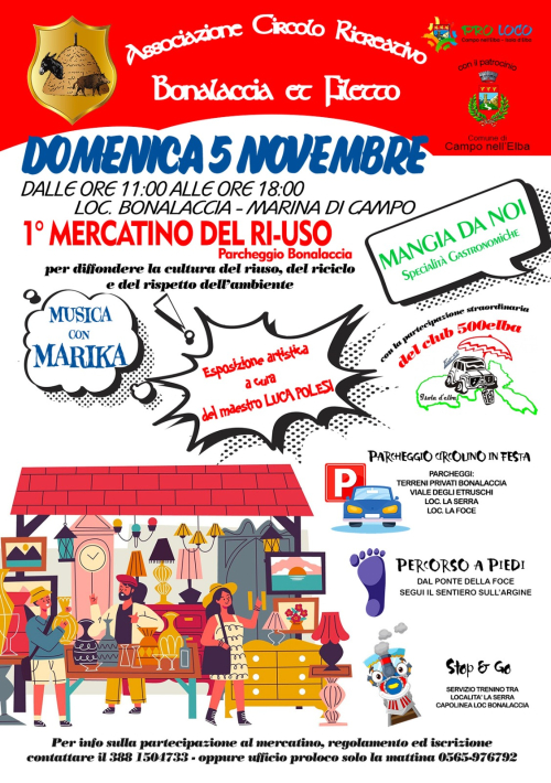 La giornata prevede un divertente programma, con musica, buon cibo esposizione artistica del maestro Luca Polesi e la partecipazione straordinaria del Club 500Elba. Principale attrattiva, sarà quella del Primo Mercatino del riuso, dove saranno allestiti numerosi banchetti da privati cittadini, con lo scopo di dare nuova vita ad oggetti giacenti nelle soffitte o cantine che essendo inutilizzati prima o poi finirebbero in discarica.